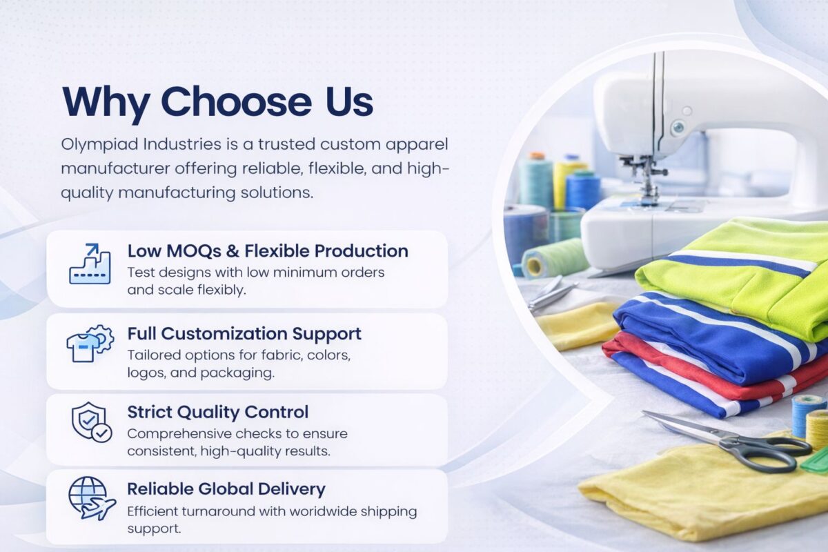 Olympiad Industries is a trusted custom apparel manufacturer committed to delivering consistent quality, flexible production, and reliable service. We work closely with brands, teams, and wholesalers to transform ideas into finished garments while maintaining strict quality standards, transparent communication, and on-time delivery. Our focus is not just manufacturing products, but building long-term partnerships with our clients.