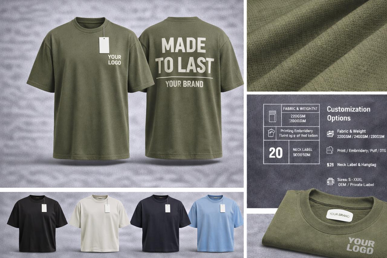High-quality custom t-shirts designed for streetwear brands, teams, businesses, and bulk buyers. Premium fabrics, multiple GSM options, and full private label customization.
