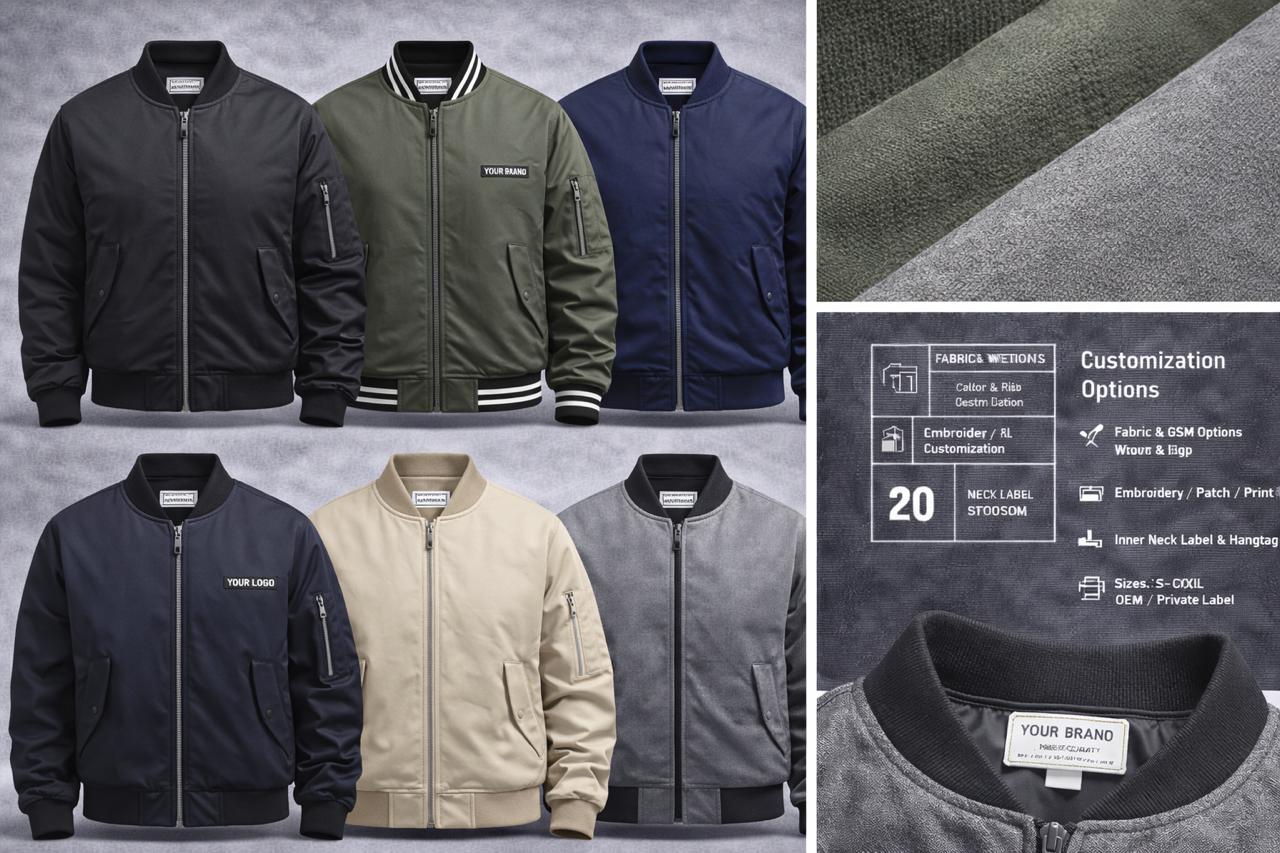 Manufactured using high-quality woven fabrics, ribbed collars, and secure zip closures, our bomber jackets are ideal for all-season wear. Full customization is available including fabric weight, color blocking, embroidery, patches, and private labeling—making them perfect for bulk production and brand scaling.